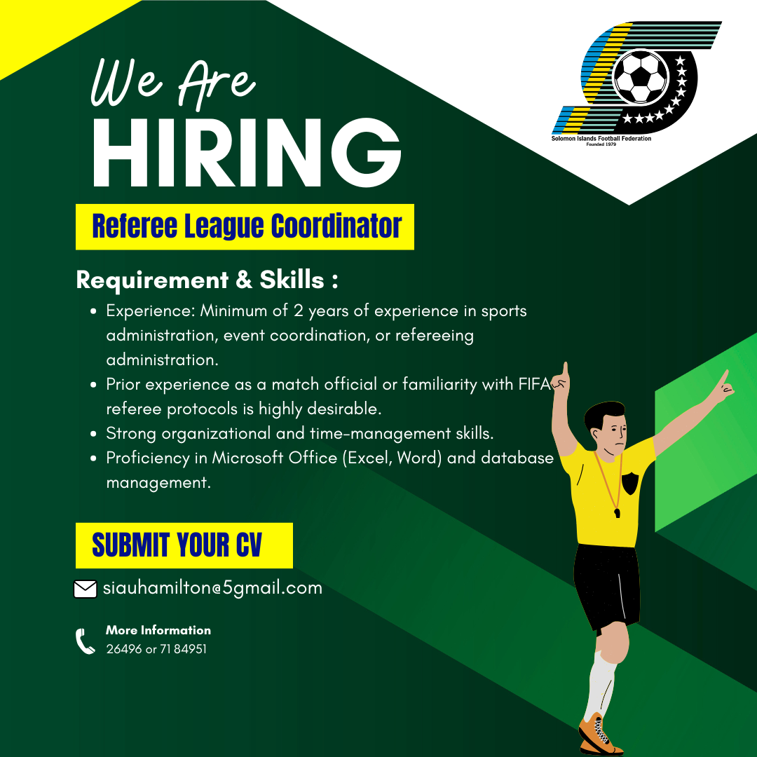 The Solomon Islands Football Federation (SIFF) is seeking expressions of interest from suitably qualified/experienced individuals for the coordination of the SIFF Referees for the 2026 football season. Interested persons are invited to submit their applications: Job Overview: The Referee…